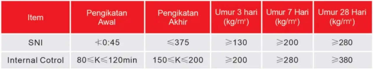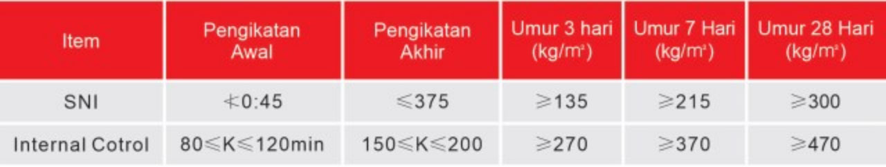 • Kandungan alkali rendah, kurang dari 0.55%, kompabilitas yang baik dengan berbagai aditif dan campuran, dan tingkat kemerosotan beton yang rendah dari waktu ke waktu.