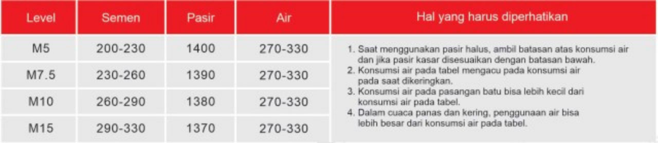 Rasio campuran mortar semen PCC Singa Merah (hanya untuk referensi)